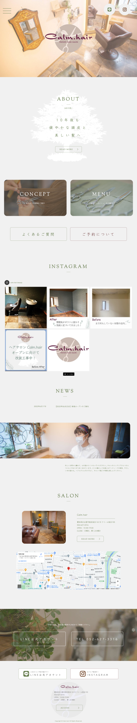 | ABOUT | 愛知県名古屋市南区にあるCalm.hair様からご依頼をいただき、ホームページ制作を行いました。 ボタニカルなイメージを意識して、癒しのあるホームページとなっています。 |