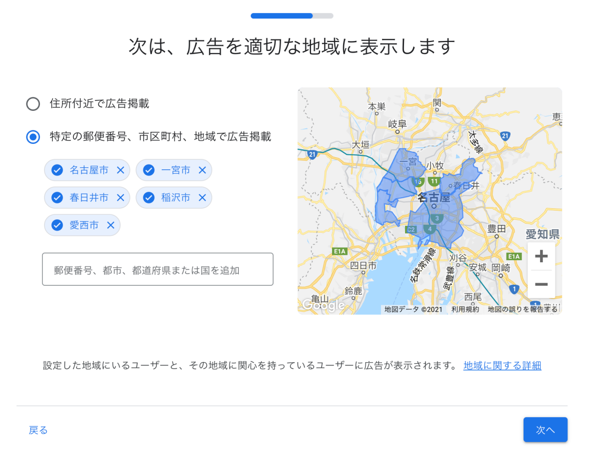 広告配信地域の設定に移ります。ここも問題ない程度に設定して次に進みます。