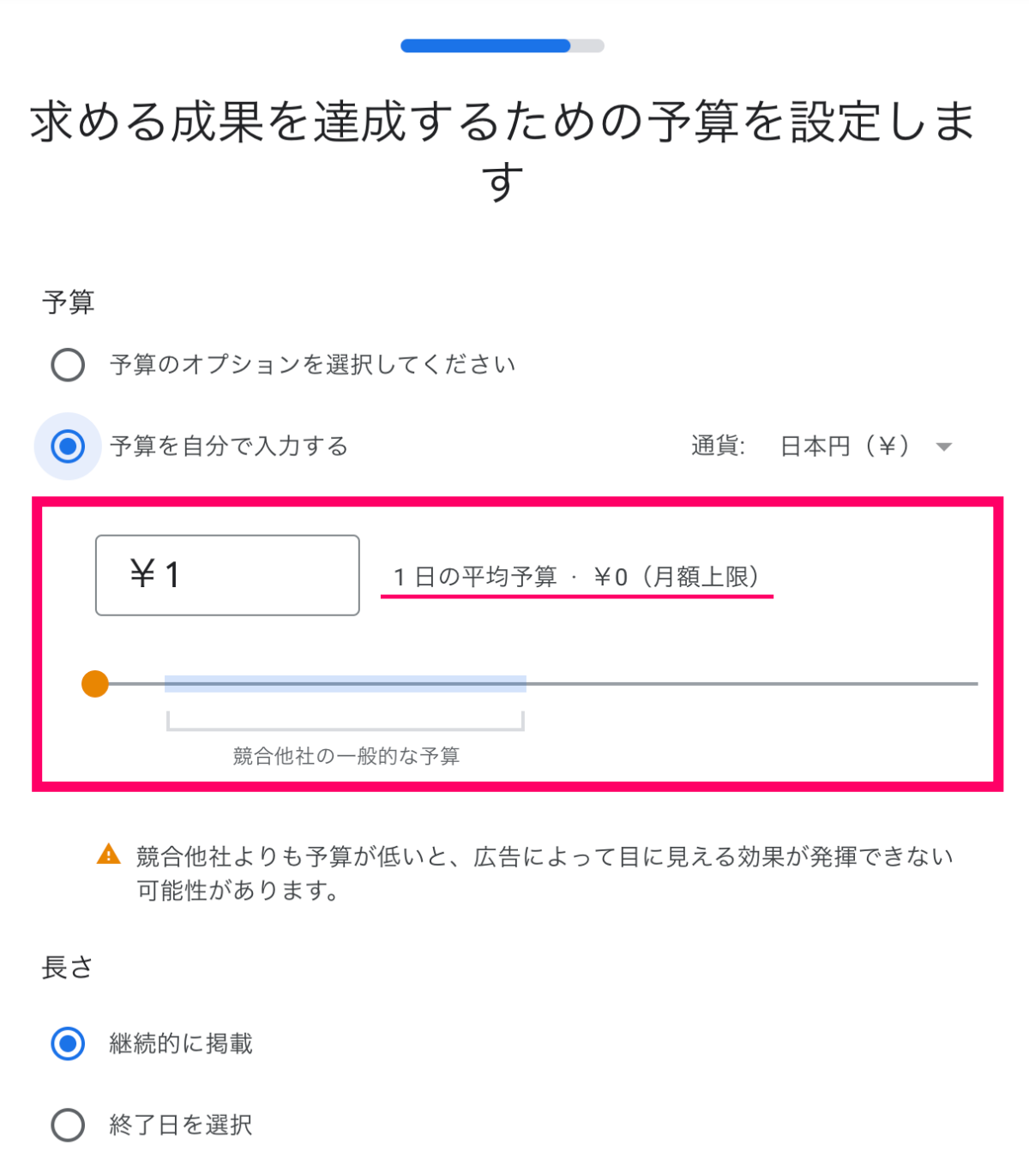 予算設定に移ります。最小金額に設定して次に進みます。※月額上限は0円にしてください。