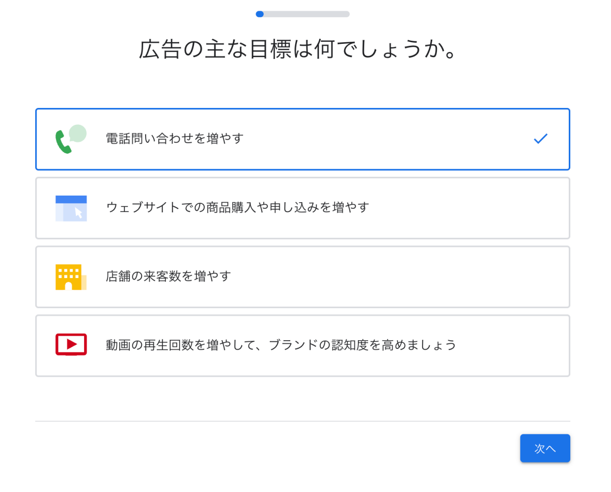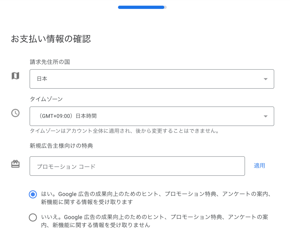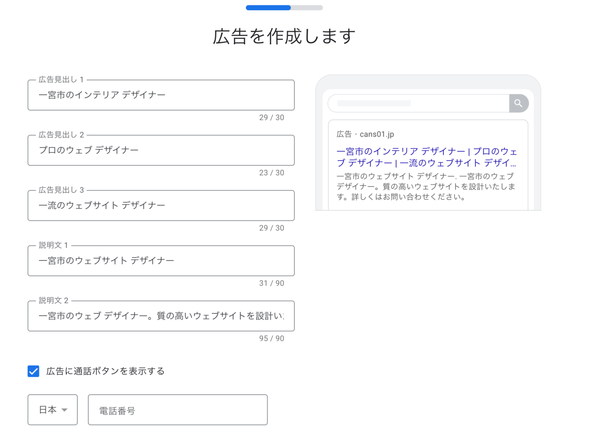 次に広告作成画面になりますが、実際に広告配信は行わないので、問題ない程度に設定して次に進みます。