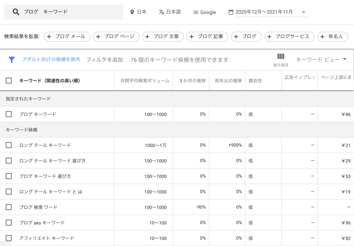 例えば今回の記事ですと、「ブログ キーワード」と入力してみます。