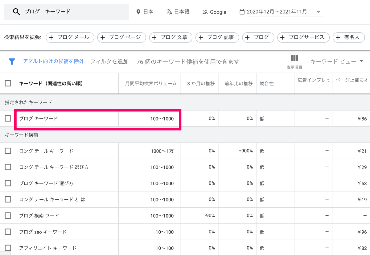 ということで、今回の記事では、月間平均検索ボリューム「100〜1000」である「ブログ キーワード」というワードを記事タイトルに入れて配信します!