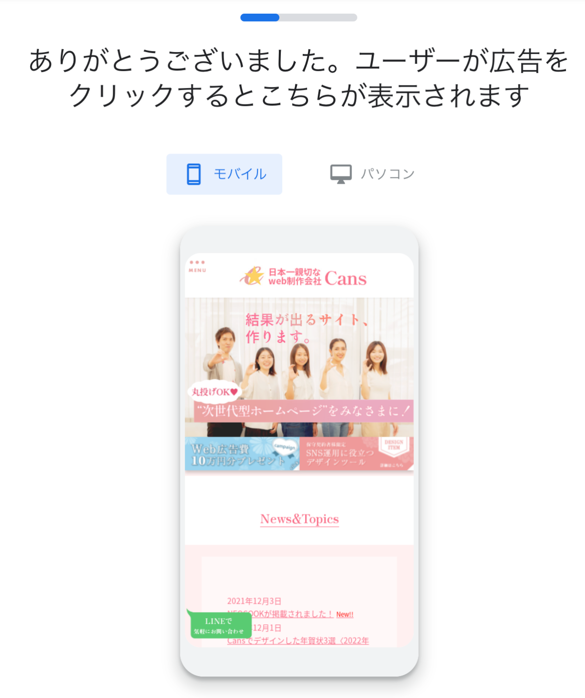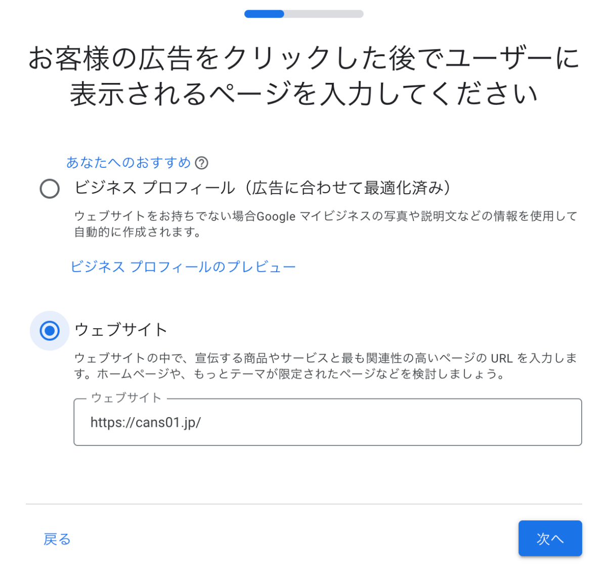 広告で誘導したいページのリンクを設定します。ホームページを見て欲しい場合は「ウェブサイト」にURLを入力してください。