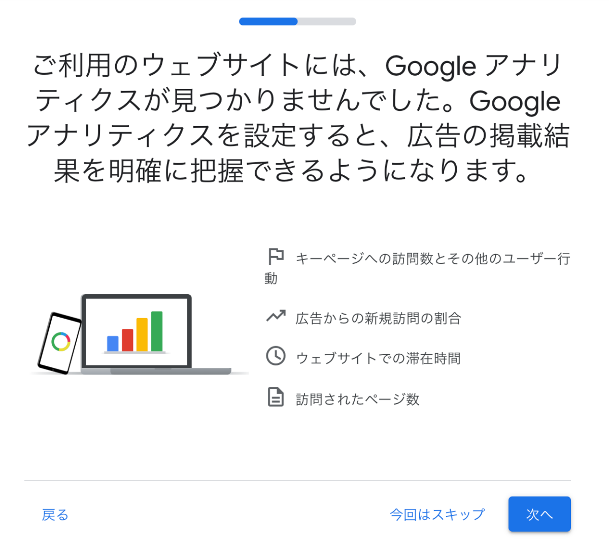 Googleアナリティクスの設定を聞かれますが、後からでも設定できますので、「今回はスキップ」で問題ありません。