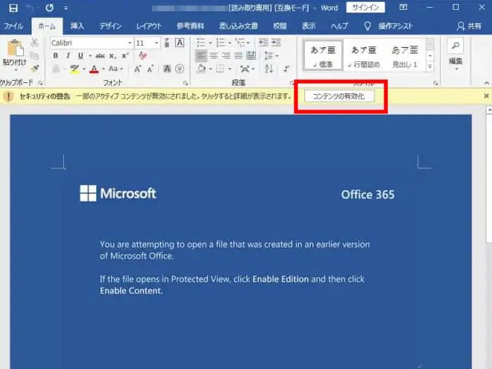 「コンテンツの有効化」「編集を有効にする」を押さないよう注意しましょう。