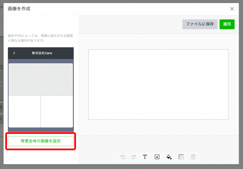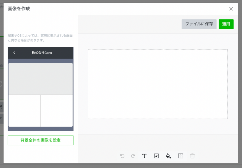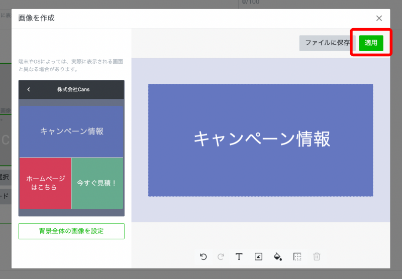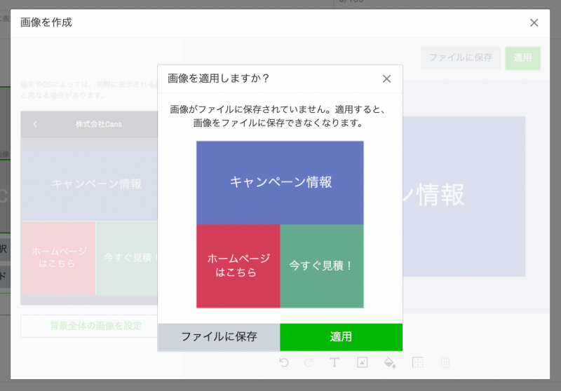 作成した画像は適用後に消えてしまうため、データとして残しておきたい場合は、『ファイルに保存』で保管しましょう。