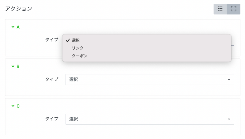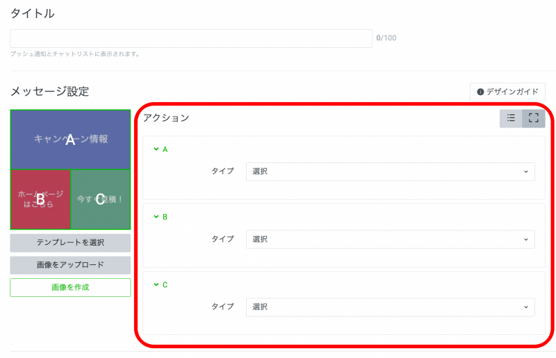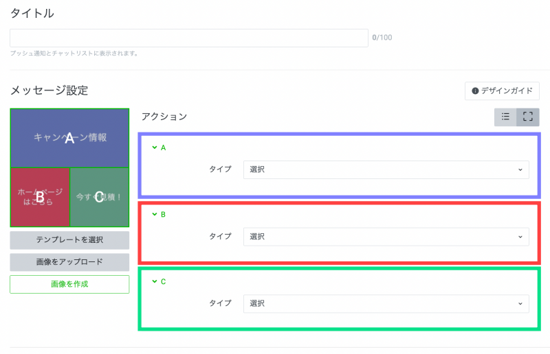 アクションのA,B,Cは画面左のメッセージ設定のA,B,Cとリンクしています。各エリアに対してのリンクをここで設定します。
