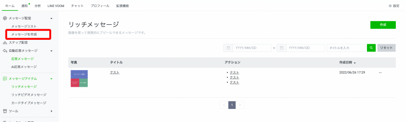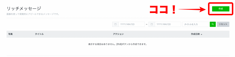 リッチメッセージの管理画面が開きましたら『作成』をクリックします。