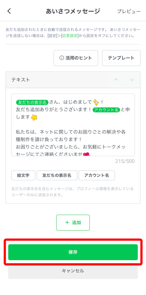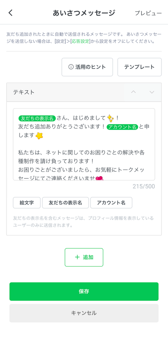 挨拶文を入力したら、このまま設定完了としても良いのですが、せっかく追加してくれたユーザーにメッセージを送ることができるのですから、もう少し訴求したいですね。