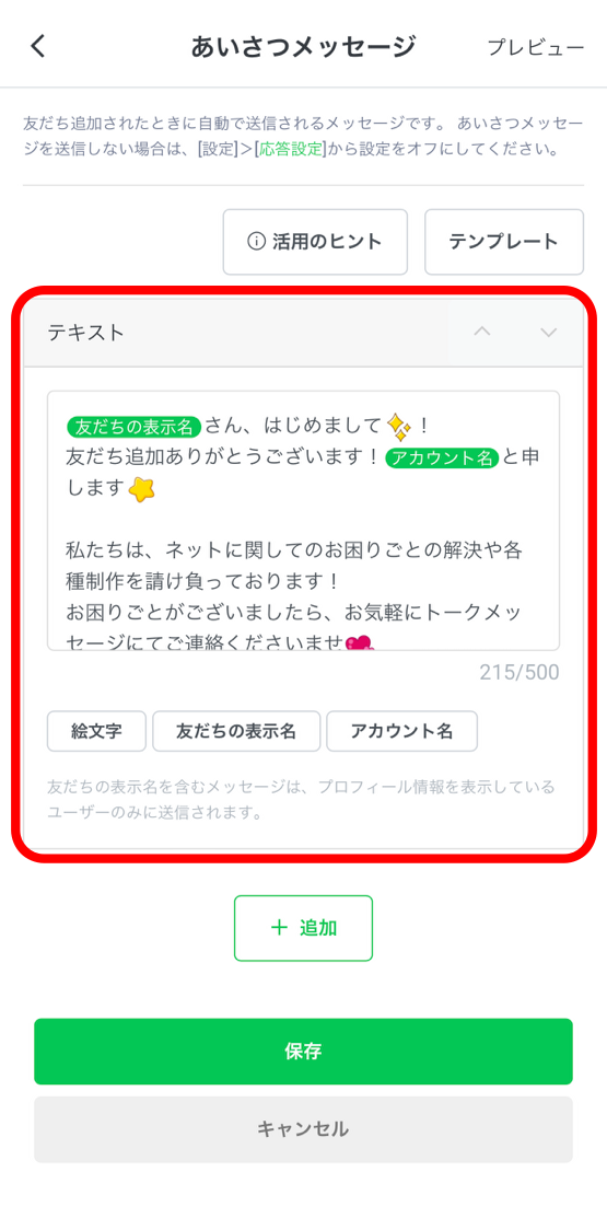 最初に表示されているテキストがあいさつメッセージ文の編集画面になります。