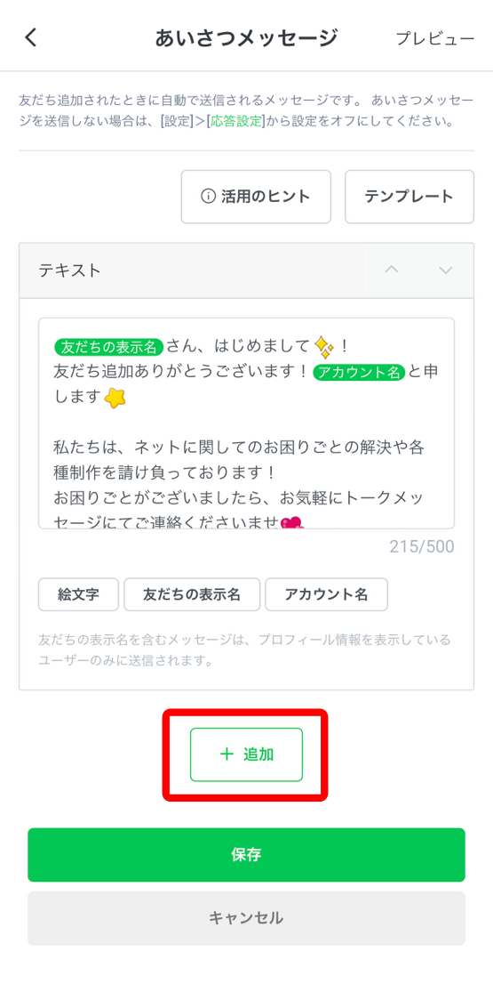 挨拶文に加えて情報を送りたい場合は、挨拶文の下にある『追加』を選択してください。