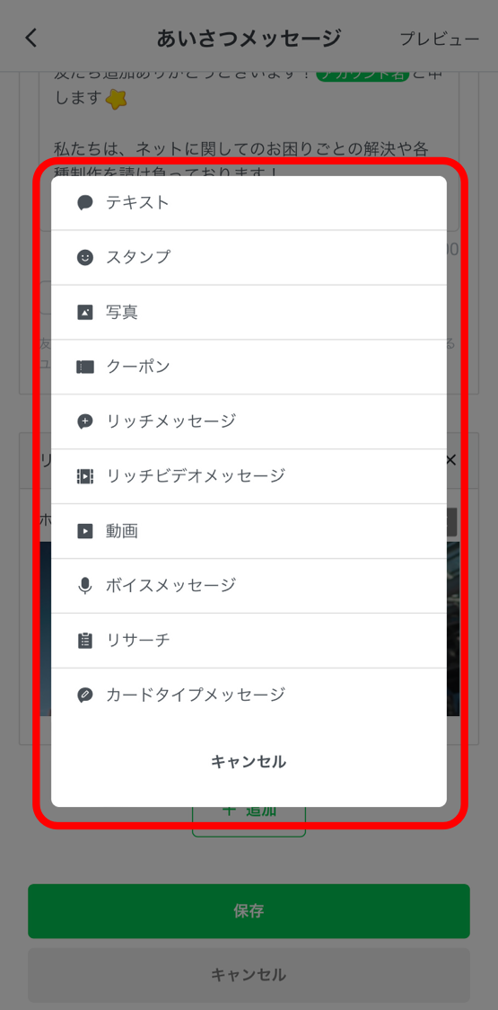 もっと凝りたい方は、リッチメッセージやリッチビデオメッセージ、カードタイプメッセージを入れることができます。