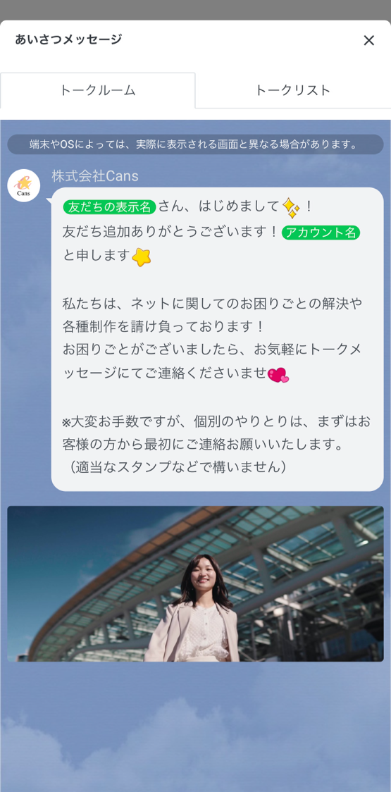あいさつメッセージは友だち追加後に一番最初に配信されるメッセージです。