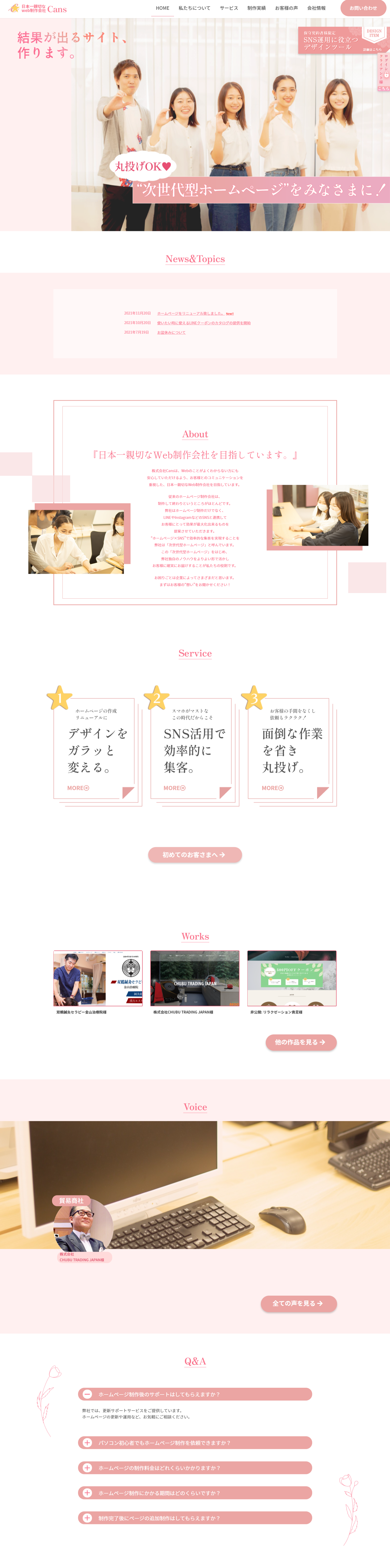 | ABOUT | 以前のサイトからデザインを一新いたしました。 弊社のメインカラーであるピンクを基調にサイトをデザインしました。また、動きのあるデザインサイトにしたため、サイト全体の動きも楽しんでいただければと思います。 |