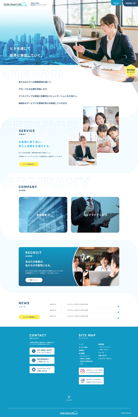 | ABOUT | 東京都千代田区にあるスマイルハートライフ株式会社様のホームページ制作を行いました。 青空をイメージした爽快感のあるデザインにて制作させていただきました。 |