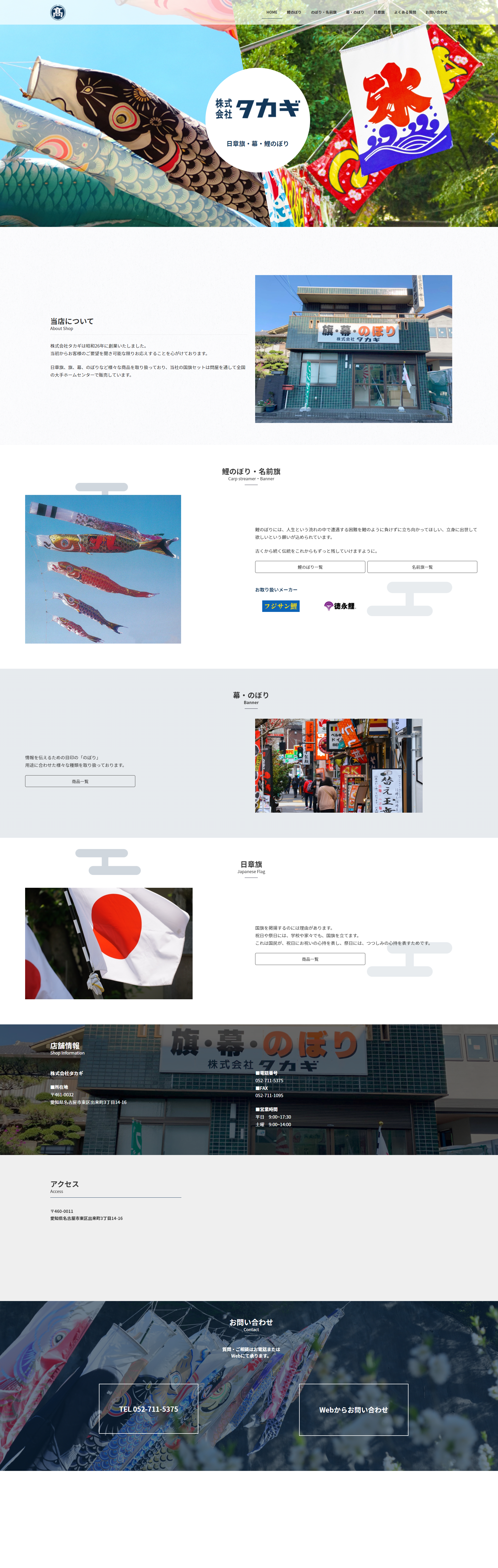 | ABOUT | 名古屋市にある「日章旗、旗、幕、のぼり」などの商品を取り扱われている株式会社タカギ様からご依頼をいただき、ホームページ制作を行いました。 創業から約70年続く長年の歴史を壊さぬようタカギ様の思いを大切にし、また親しみを持っていただけるよう優しい色合いを意識しました。 ひと目で情報を把握できるよう見やすさを心掛けました。 |