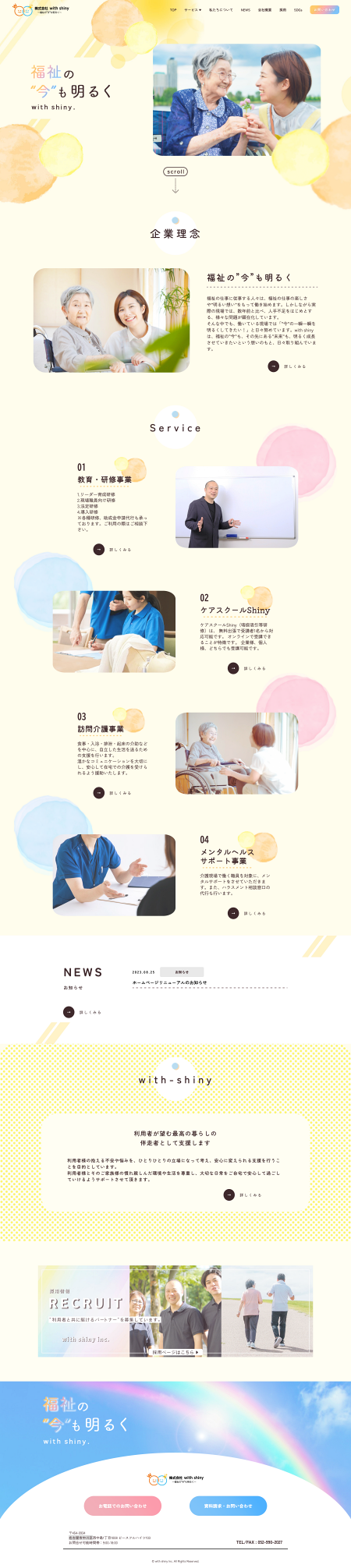 | ABOUT | 名古屋市中川区にある株式会社with shiny様のホームページ制作を行いました。 光芒をイメージした温かみのあるデザインにて制作させていただきました。 |